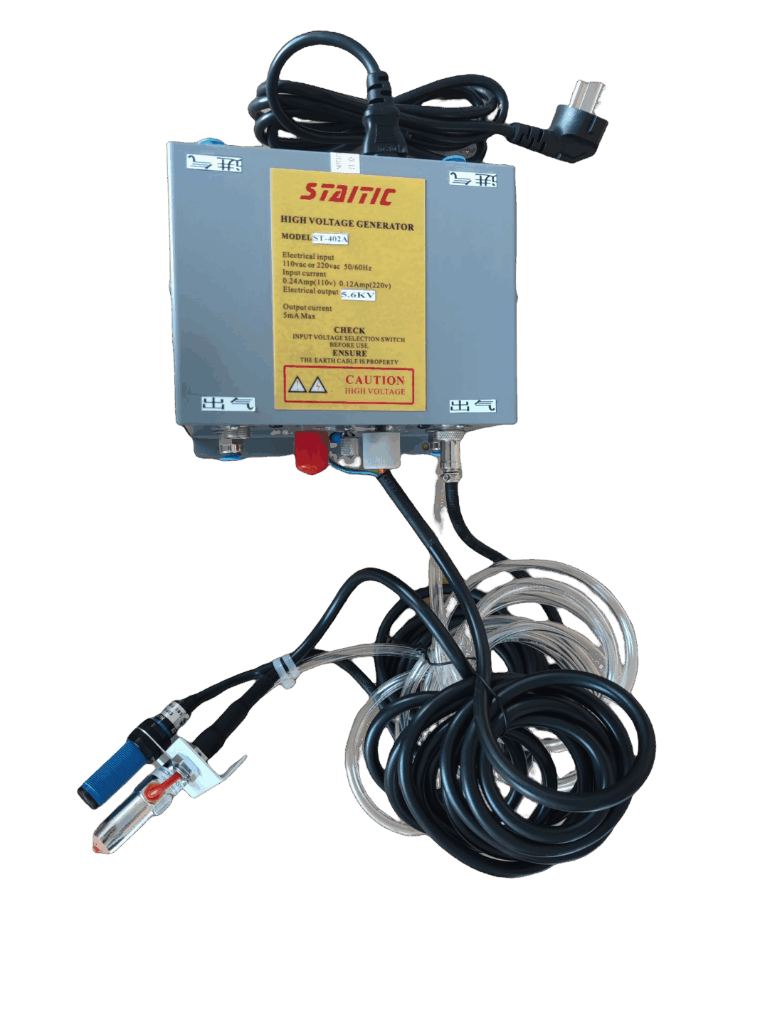 將風(fēng)嘴連接線末端插入高壓發(fā)生器高壓輸出插孔,順時針旋轉(zhuǎn)到頭,然后將風(fēng)嘴連線的接地線連接到高壓發(fā)生器外側(cè)的接地柱上,并確認(rèn)接地良好后,將高壓發(fā)生器的電源插頭插入帶有接地線的插座上(注意高壓發(fā)生器的使用電壓),將風(fēng)嘴固定安裝到合適的位置,插上壓縮氣管,打開高壓發(fā)生器電源即可工作。
